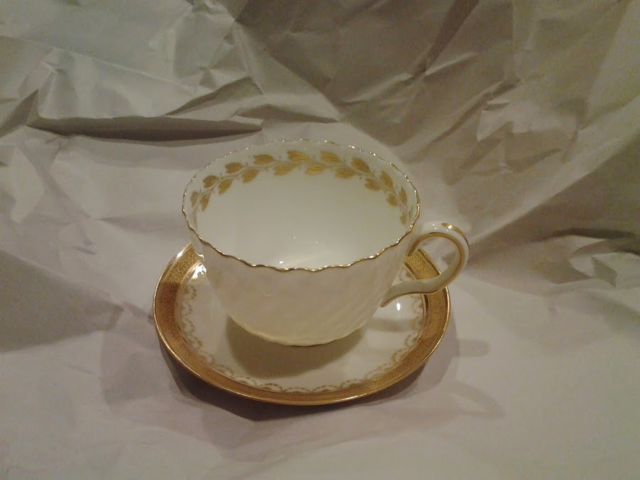 The cup is ivory with a swirl shape and a golden leaf pattern on the inner rim. It’s genuine bone china from England but has no maker’s mark.